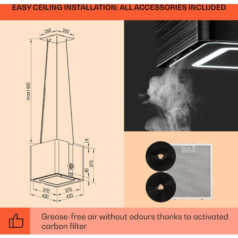 Free-hanging: ceiling-mounted island hood with 200-watt motor power