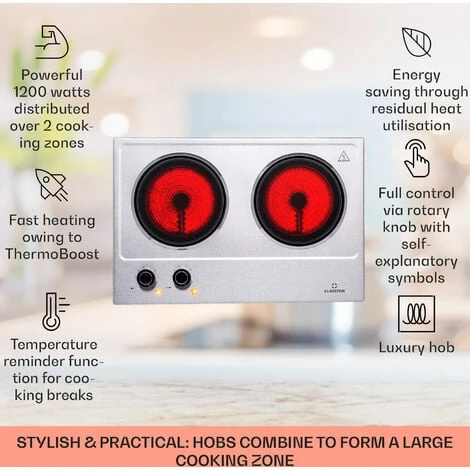 The two cooking zones of the hob are operated easily with two thermostatic knobs. 11 power levels allow gentle simmering as well as rapid heating and frying. The heated surface allows economical cooking with residual heat even after switching off. After cooking, the hotplate is clean again in no time thanks to its easy-care combination of stainless steel and glass ceramic. Owing to its compact size, the Klarstein Ramsey double hob is ideal as a mobile travel companion, for example on camping trips or for summer retreats in the garden shed.