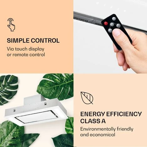 When food smells make their rounds in the kitchen, the design-strong Klarstein Remy cooker hood is there to help. With 230 watts of motor power, 3 speeds and up to 619 m³ / h maximum exhaust air output, it powerfully removes steam and haze. Flexible: It serves as a ceiling hood above a cooking island or as a built-in and under-cabinet hood in the fitted kitchen. You can control it easily via the touch display or conveniently by remote control and illuminate the cooking surface with a switchable LED light. You can also convert it to recirculation mode with activated carbon filters.