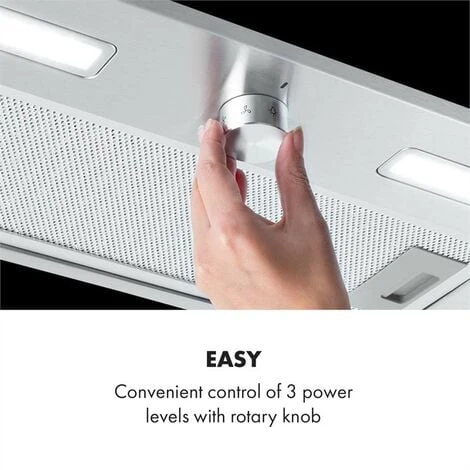 The Klarstein Simplica provides 125 watts of engine power in the exhaust air mode for vapour-free air in small to large kitchens. Three power levels deliver up to 400 m³ of exhaust air per hour and adapt the built-in hood to the respective cooking volume. The special feature of the 52 cm wide Simplica is the ability to fully integrate into the kitchen. Unlike most built-in hoods, it disappears into the kitchen cupboard above the stove and reveals itself only with its elegant underside made of brushed stainless steel. At the front edge of the Simplica is a practical and stylish knob that controls ventilation and lighting. The switchable light with 2 x 1.5 W LED lamps also ensures good visibility on the cooking surface at all times.