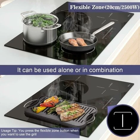 - 🥩【Flexible Zone】This area can be used as a large area or as two separate areas depending on the cooking needs at any time. The induction hob with flexible zone is particularly suitable for Grill Pan and round pan .You can get a large enough cooking zone to cook meat and fish evenly.