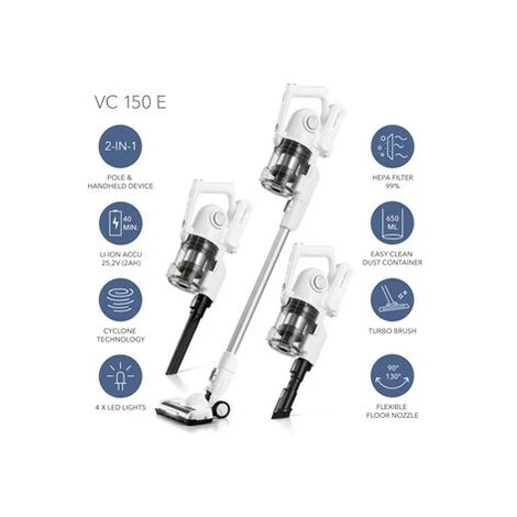 When fully charged, the powerful 25.2 V lithium-ion battery (2 Ah) ensures a constantly high suction power for over 40 minutes in continuous operation. With the 2-stage battery capacity indicator you always have an eye on the charge level. Thanks to the high-quality Li-Ion battery technology, neither memory effects nor self-discharge occur. The floor nozzle is equipped with four LED lamps in the front area, with which dark areas under the sofa or under cupboards can be perfectly illuminated. The scope of delivery includes a hand-held hoover, a power supply unit, one upholstery, furniture and crevice nozzle each, an electric floor nozzle, an aluminium extension tube and an installation station. Thanks to its space-saving design, the VC 150 E can be conveniently stored anywhere.