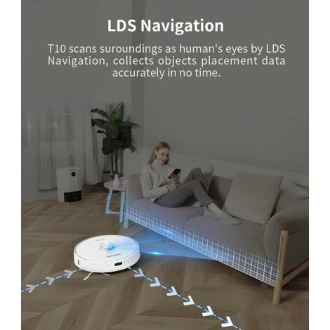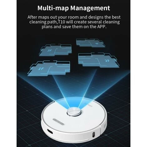 No-Go-ZonesYou can set up virtual boundaries (no magnetic strip required) through APP to make Ultenic T10 only work in the area you want and keep away from certain areas or objects with customizable keep-out zones or no-mop zones. For example around pet bowl, children’s play area, bathroom and other areas. | Restart from Where It StopsThe T10 robot vacuum will automatically go back to recharge when it’s running low on battery or when it finished the cleaning. And the T10 robot will reclean the areas where it didn’t finish cleaning because of the low battery when fully charged to ensure a complete clean. | Obstacle climbing ability and Anti-drop SensorIntelligently recognize the height of obstacles in front, the T10 robot can easily climb over low-pile carpets and door ledges (lower than 20mm) with its large wheels. It can also detect stairs and edges with its built-in underneath infrared sensors to avoid falling off, making sure it is in safe cleaning condition. |